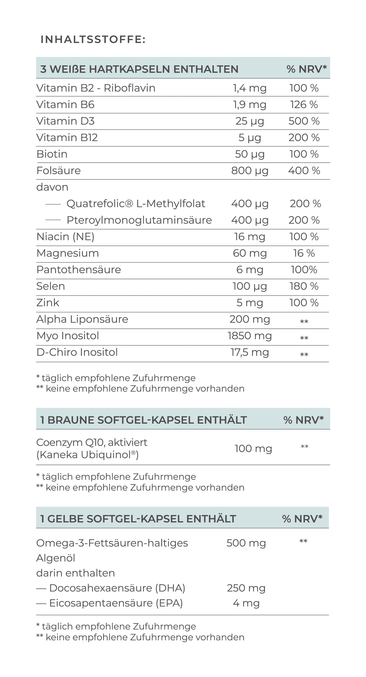 Alpha Liponsäure Biotin D-Chiro Inositol Quatrefolic® Folat Folsäure Magnesium Myo Inositol Niacin Pantothensäure Riboflavin Selen Vitamin B6 Vitamin B12 Vitamin D3 Zink |